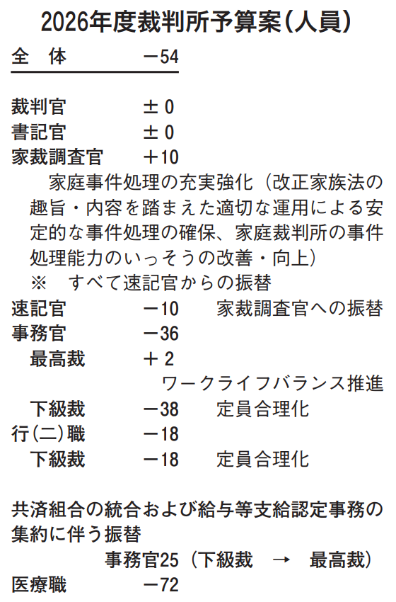 一方で、下級裁の事務官38人および行(二)職18人の計56人の合理化のほか(定員合理化との差し引きで54人の大幅減員)、医療職は常勤医師の確保が困難であることを理由に72人を削減(非常勤医師の拡充で対応)するとしています。